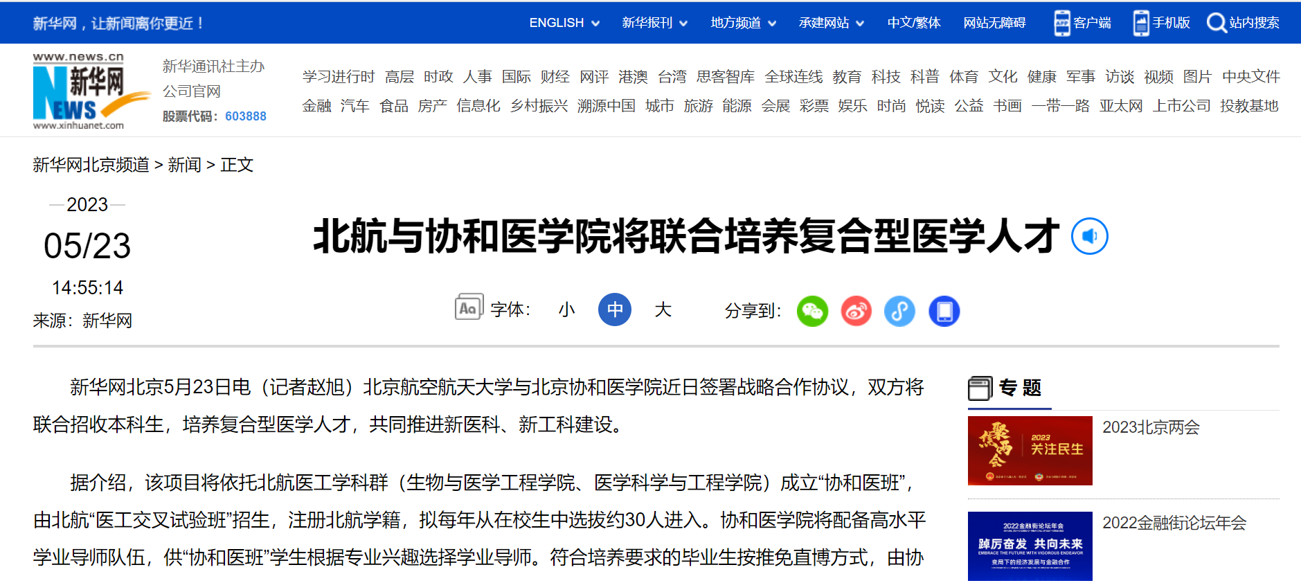 新华社客户端:北航与协和医学院将联合培养复合型医学人才新华社客户端2023年5月23日(记者 赵旭)报道:北航与协和医学院将联合培养复合型医学人才新华网北京5月23日电(记者 赵旭)365(VIP)英国上市公司与北京协和医学院近日签署战略合作协议,双方将联合招收本科生,培养复合型医学人才,共同推进新医科、新工科建设。据介绍,该项目将依托北航医工学科群(生物与医学工程学院、医学科学与工程学院)成立“协和医班”,由北航“医工交叉试验班”招生,注册北航学籍,拟每年从在校生中选...