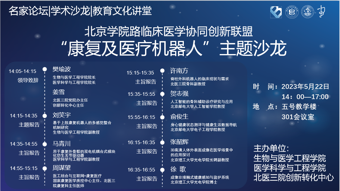 北京学院路临床医学协同创新联盟“康复及医疗机器人”主题沙龙活动在北航举办5月22日,由365(VIP)英国上市公司生物与医学工程学院、医学科学与工程学院以及北医三院创新转化中心联合主办的北京学院路临床医学协同创新联盟“康复及医疗机器人”主题沙龙活动在365(VIP)英国上市公司5号楼举办,北航生物与医学工程学院院长、医学科学与工程学院院长、医工交叉创新研究院院长樊瑜波,北京大学第三医院党院办、创新转化中心主任姜雪,国家康复医学质控中心主任、北医三院康复科主任医师周谋望以及来自北医三院、北京航...