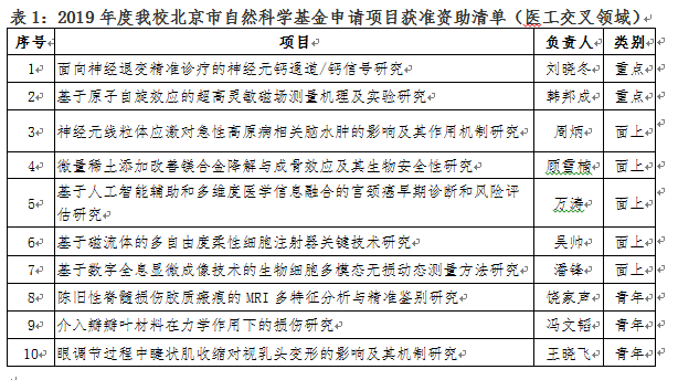 我校北京市自然科学基金在医工交叉领域取得突破近日,北京市自然科学基金委员会办公室公布了2019年度北京市自然科学基金拟资助项目名单。在集中申报期,我校在医工交叉领域共有10个项目获批,其中重点2项,面上项目5项,青年项目3项。在此前公布的2018年度北京市自然科学基金-海淀原始创新联合基金拟资助项目名单中,我校在医工交叉领域获批重点研究专题2项,前沿项目2项。我校在北京市自然基金项目医工交叉领域取得突破,得益于学校近年大力发展医工交叉,服务临床诊...