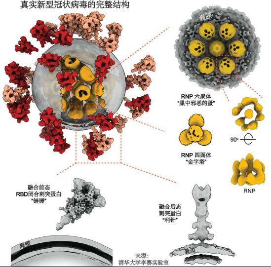 这项研究首次解析了新冠病毒全病毒的高分辨率分子结构,使世界对新冠病毒的认识更近一步,为抗击疫情、治疗新冠肺炎打下坚实全面的结构基础。在这项研究中,浙江大学李兰娟团队提供了灭活的新冠病毒培养液,清华团队提纯浓缩病毒后,使用实验室开发的高通量、高分辨冷冻电镜断层成像技术(cryo-ET),采集了100TB数据,并重构出一颗具有代表性的完整的病毒三维结构。统计结果表明,新冠病毒囊膜平均直径约80纳米,表面约有30个刺突蛋白,内部约有30个核糖核蛋白复合物。