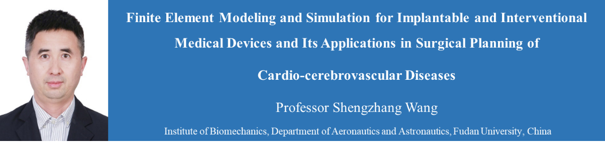 Prof. Shengzhang Wang is Associate Professor at the Institute of Biomechanics, Fudan University. He has a Bachelor degree (1999) and Master degree (2002) in the Department of Mechanics and Engineering Science of Fudan University. He has PhD degree (2006) in Mathematics from Hokkaido University, Japan. His main research interests are: Biomechanics for cardiovascular and cerebrovascular diseases, the implantable and interventional devices such as flow diverter, stent-graft and artificial heart valve. He has published more than 50 peer-review papers. His main findings include hemodynamic assessment of the risk of cerebral aneurysm rupture, virtual implantation of flow diverters, surgical planning for interventional therapy for cerebral aneurysms, finite element simulation for stent-graft implantation to treat aortic dissections, fluid-structure interaction simulation of aortic valve and surgical planning for repairing aortic stenosis.