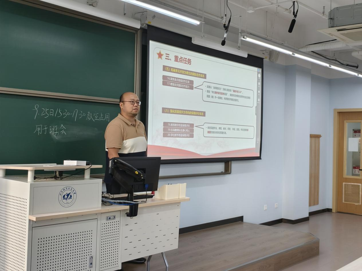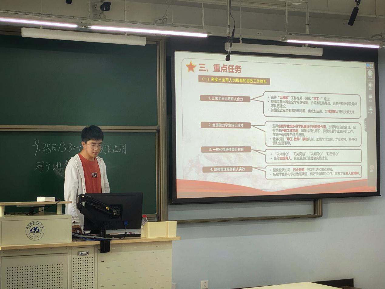 郭鹏宇辅导员结合社会现状和北航学子的生活实际,深入浅出地讲解了文件纲领,引导同学们将个人成长与国家发展紧密相连。睿导结合研究生各项重要时间节点,强调了自身发展与职业规划的重要性强调自身发展与职业规划,提醒同学提前做出规划。在构建支持全面创新体制机制的当下,北航紧跟国情国策,坚持了诸如“三位一体”推进改革、健全德智体美劳全面培养体系的方针,校内开展的“冯如杯”科创竞赛更是推进成果转化的有力引擎。在“完善意识形态工作责任制“方面,郭鹏宇辅导员号召同学们坚持马克思列宁主义、毛泽东思想、邓小平理论、“三个代表”重要思想、科学发展观和习近平新时代中国特色社会主义思想不动摇。