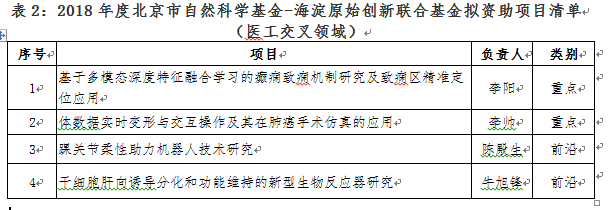 近日,北京市自然科学基金委员会办公室公布了2019年度北京市自然科学基金拟资助项目名单。在集中申报期,我校在医工交叉领域共有10个项目获批,其中重点2项,面上项目5项,青年项目3项。在此前公布的2018年度北京市自然科学基金-海淀原始创新联合基金拟资助项目名单中,我校在医工交叉领域获批重点研究专题2项,前沿项目2项。