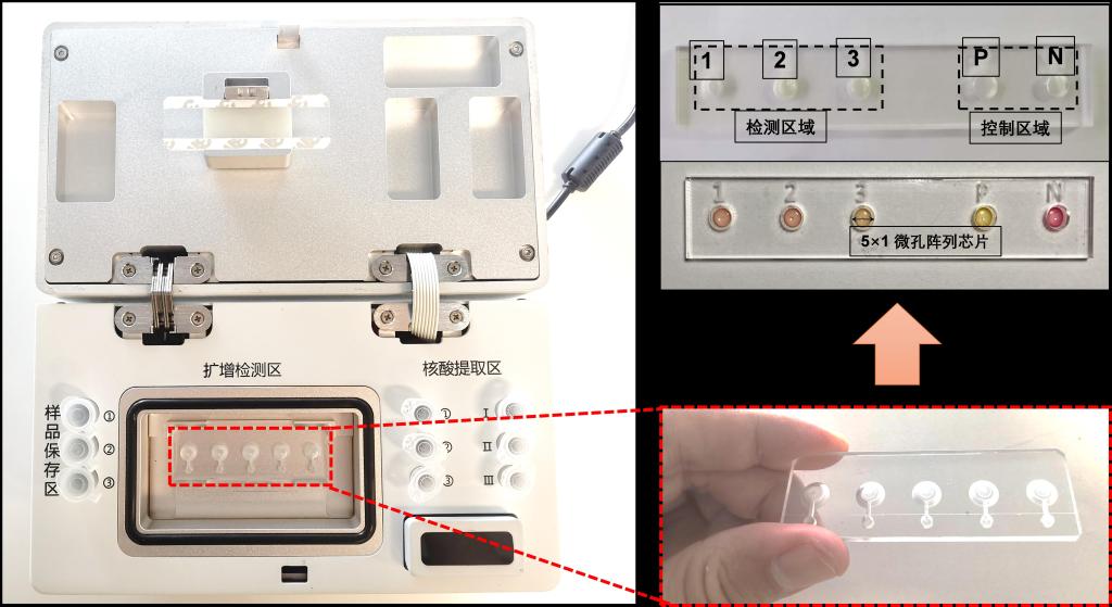 当前全球新冠肺炎确诊人数持续增加,我国疫情已进入常态化防控阶段,面对广泛场景,如机场、车站、社区医院、乡村卫生站、居家自测等环境下,快速、精准、便携式和低成本的新冠病毒和其他病原体检测预警平台,具有重要的时效性和重大意义。近日,我校和四川大学华西医院联合团队设计和研发了一款高灵敏度、快速、高通量病原体即时快速检测平台,由便携式检测仪和恒温扩增检测微孔阵列芯片构成。