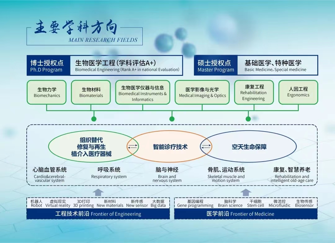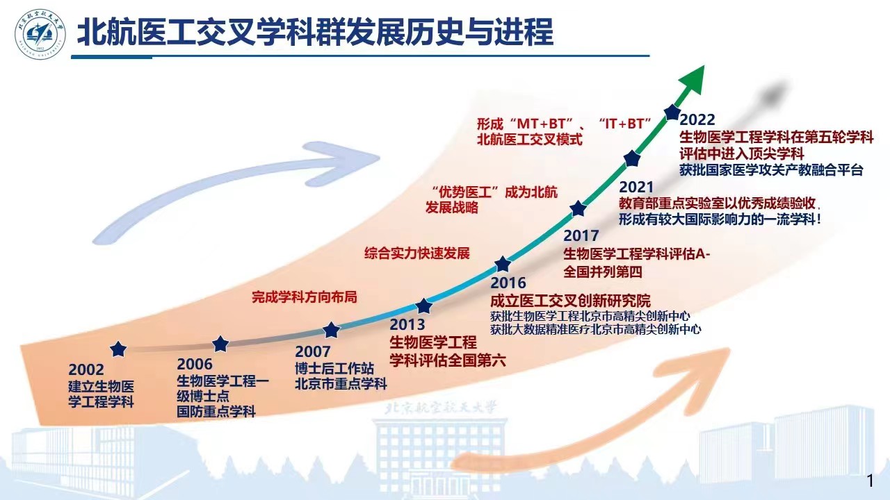 医工交叉学科群依托北航顶尖工科,笃行“医工交叉、两个面向(面向医疗装备与器械、面向航空航天生命保障)”的发展理念,以与人民健康密切相关的世界科技前沿和国家战略需求为导向,深度推进优势工科与生物医学交叉融合,形成了北航医工交叉融合的“MIBT”模式(MT+BT,IT+BT)。2022年“优势医工”建设取得了历史性、标志性突破,生物医学工程学科在第五轮学科评估中进入顶尖学科行列、获批创建高端医疗装备与器械国家医学攻关产教融合创新平台(医工结合方向)。通过高起点规划、高质量建设,经过二十年跨越式发展,北航医工已成为接轨国际、全国顶尖的医工交叉人才培养和科学研究基地,获得了国内外同行的高度认可。