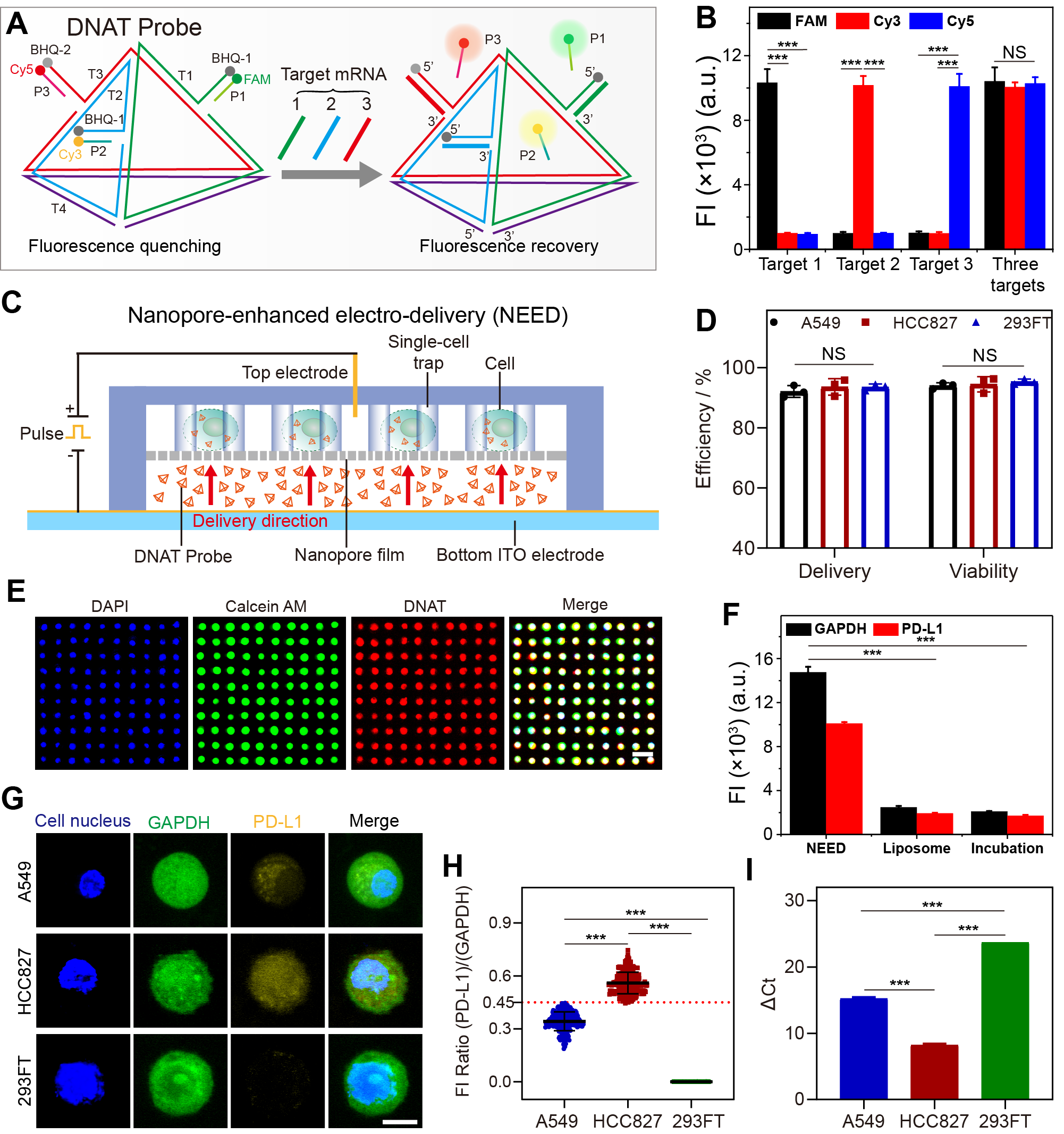 为了实现活CTCs内PD-L1基因的准确检测,研究者们设计了一种具有四面体结构的DNA探针,该探针的三条边上的识别序列分别用于识别3种不同的mRNA,通过不同的荧光标记,实现了PD-L1基因,内参GAPDH基因,以及CTCs鉴定基因的同时检测。该探针具有良好的特异性,且能长时间抵抗核酸酶的降解。利用纳米电穿孔技术,该探针能在2秒内实现对95%以上细胞的递送,且细胞保持良好的活性,与其他常规方法相比,纳米电穿孔技术展示出更高的递送性能(图2)。
