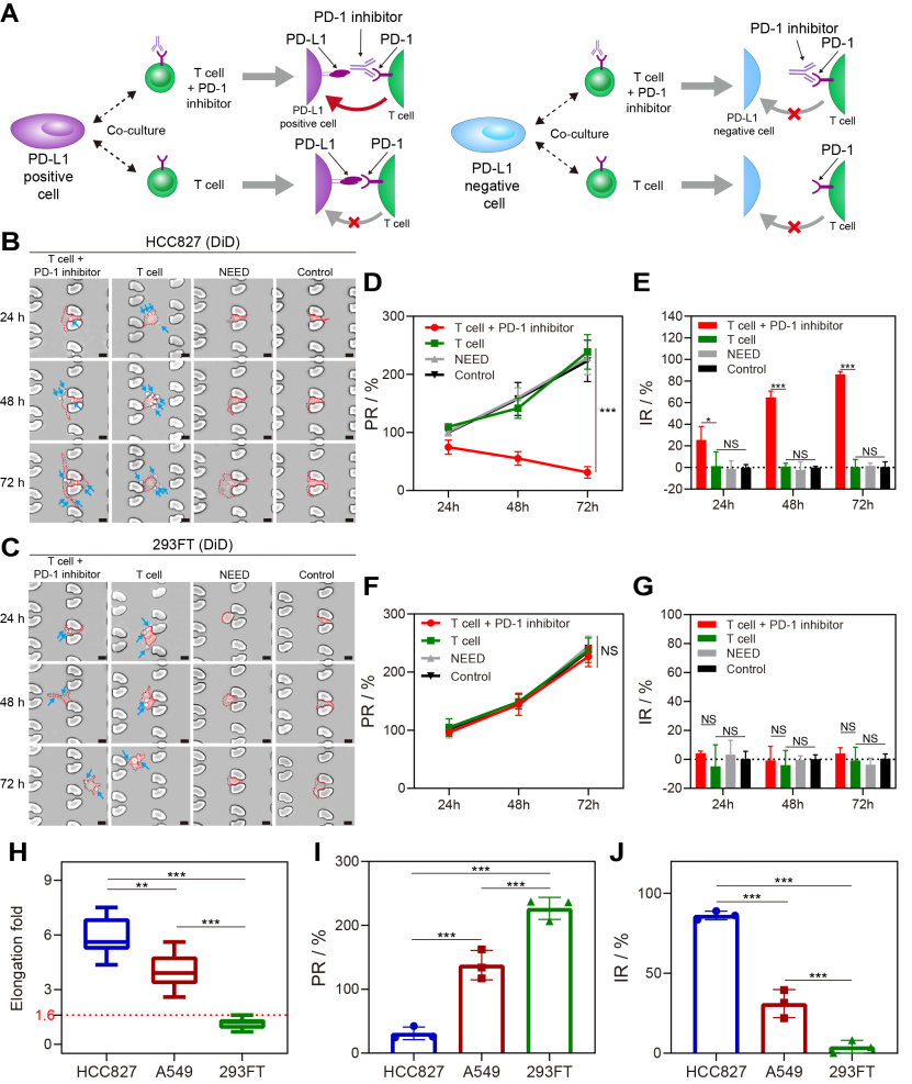 完成基因检测的CTCs,保持了良好的活性,通过与免疫T细胞的共培养,研究者们发现,部分肿瘤细胞在免疫抑制剂存在时,细胞形态发生了明显的变长,且细胞增殖行为被显著抑制(图3)。根据肿瘤细胞PD-L1的表达情况,研究者们划分出了PD-L1高表达与低表达的阈值;另外,根据肿瘤细胞与免疫细胞共培养的结果,研究者们划分出了肿瘤细胞形态发生变化的阈值。综合CTCs中PD-L1高表达(PD-L1high)且表型发生变化(PA+)的占比,该研究定义了一种新的指标,“NICHE index”,用于预测癌症患者响应免疫疗法的疗效。