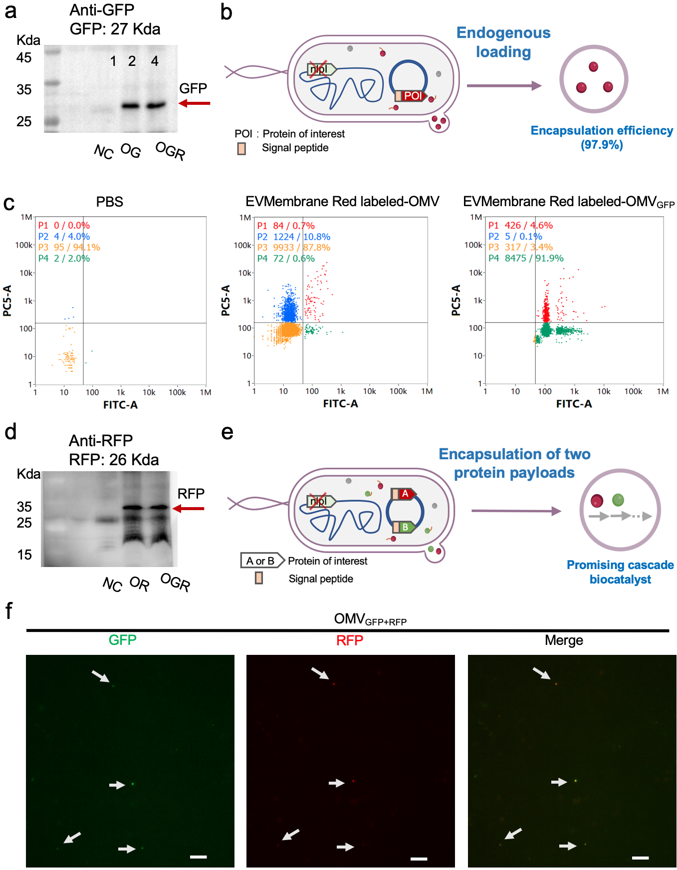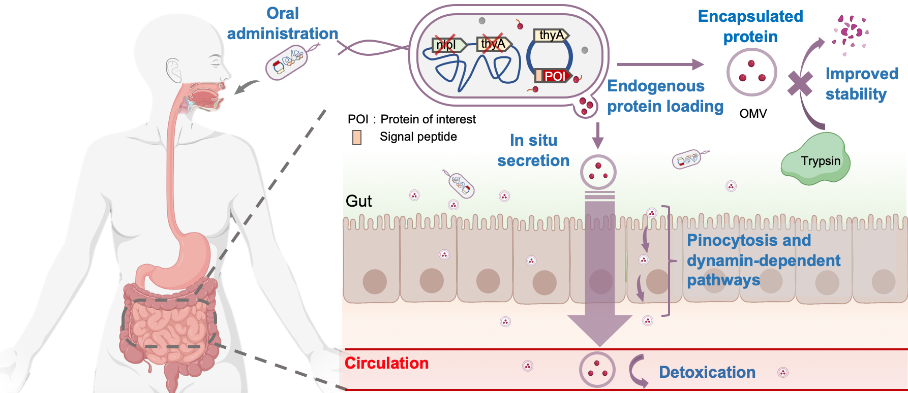 该研究首次发现一种益生菌在肠道产生的细胞外膜囊泡(OMV)可以跨越完整肠屏障后进入血液循环。基于这一重要发现,开发了一种新型基于工程益生菌的口服蛋白递送技术。基因工程改造益生菌使其高产OMV,并将目标蛋白酶加载到OMV中,包裹率高达97.9%。这种基于T0SS的蛋白质分泌系统与多种蛋白兼容,并能将不同种蛋白载荷自组装到单个OMV中,可以实现级联催化反应(图1)。