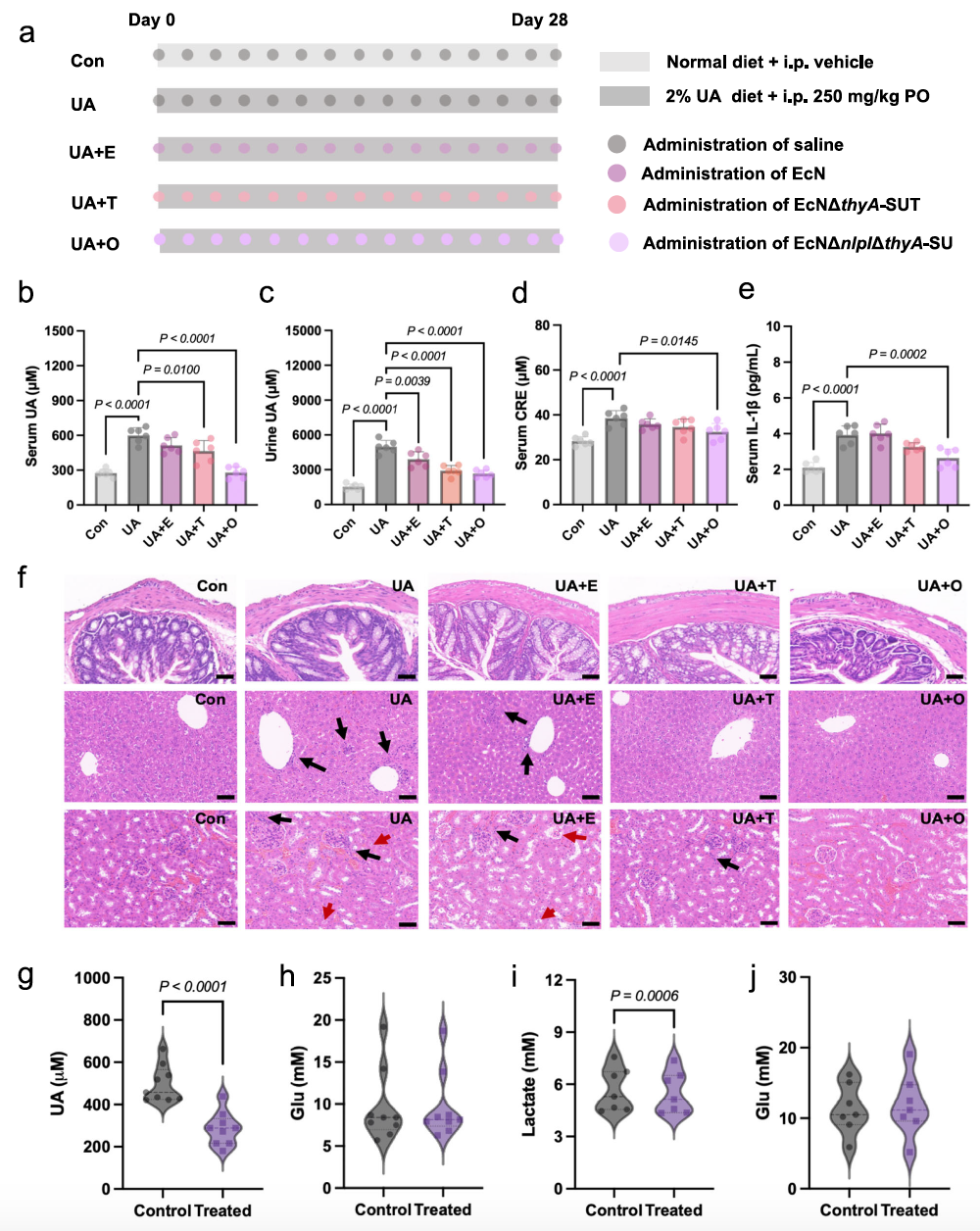 基于工程益生菌T0SS分泌的蛋白,OMV载体帮助蛋白耐受肠道消化液,并以胞饮作用和动力蛋白依赖的胞吞转运途径跨越肠屏障入血,从而稳定、高效清除血液中的有害代谢物。在高尿酸血症模型小鼠中,与直接在肠道分泌尿酸氧化酶的工程益生菌相比,以T0SS分泌尿酸酶的工程益生菌治疗效果更佳,归功于其递送的蛋白稳定性更高、作用范围更广。此外,工程化OMV与16名肺癌、痛风患者的血液样本孵育30分钟,即可显著降低乳酸或尿酸水平。